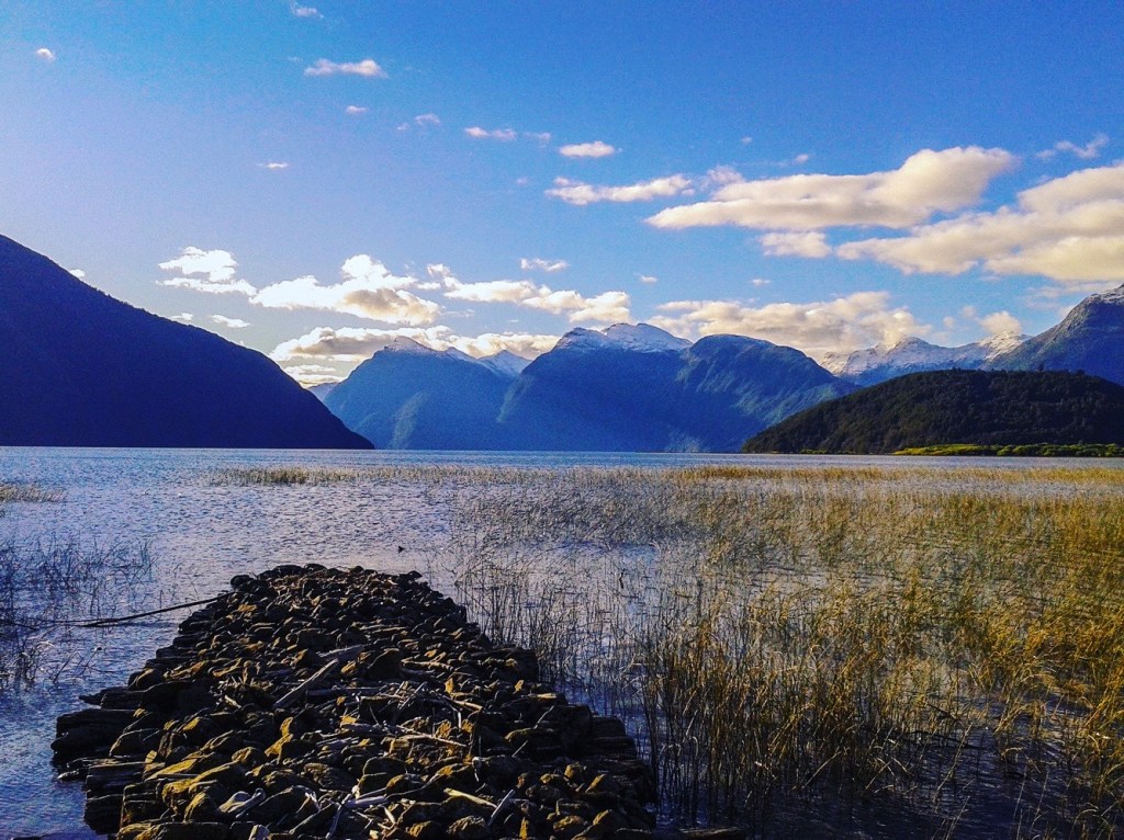 Fotografía de la zona de Puerto Piedra del lago Yelcho, Región de Los Lagos, Chile. En el fondo se puede observar la Isla Monita. (fecha de fotografía enero de 2013)